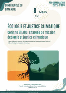 Dimanche 8 mars à 15h, une conférence par Corinne Bitaud, chargée de mission écologie et justice climatique pour l’Église Protestante Unie de France